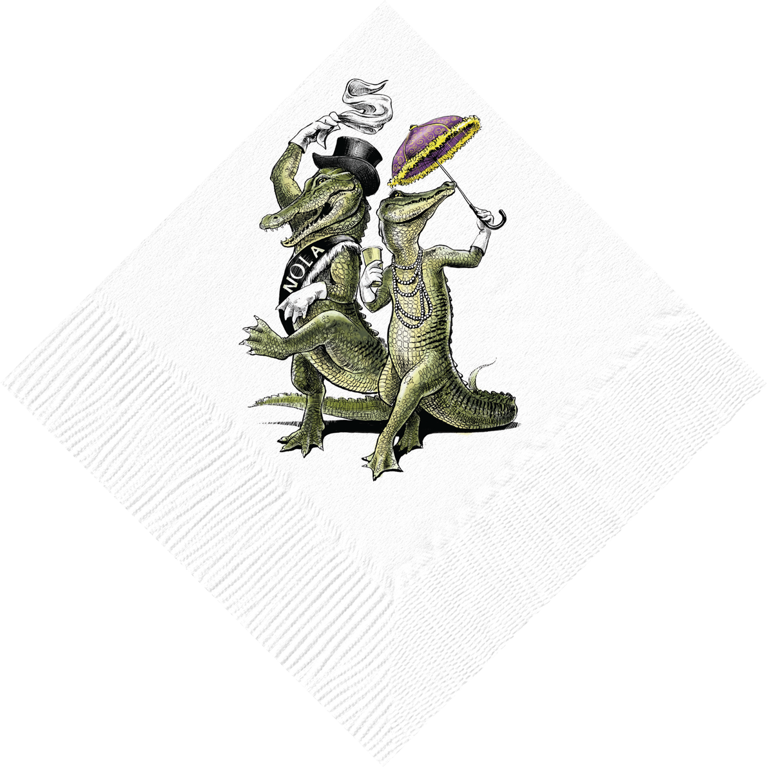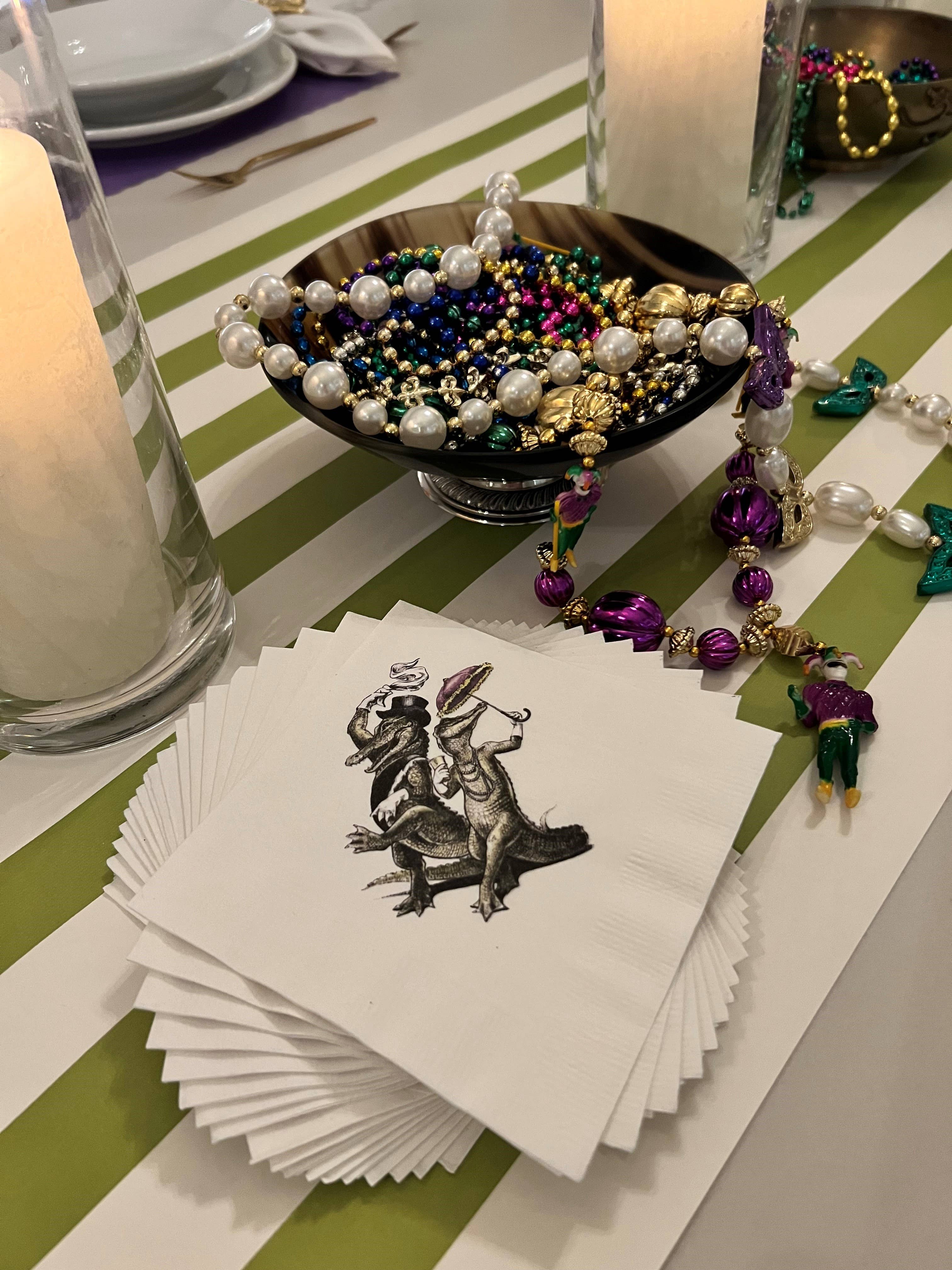 Make every hour a happy hour! These whimsical second line alligator cocktail napkins are a wonderful addition to any Mardi Gras celebration or wedding — whether you’re hosting 2 or 200. Alexa Pulitzer's hand-drawn illustrations are created in her New Orleans atelier and printed in the USA on 3-ply paper napkins. DETAILS * 5” square 3 ply napkin * 20 napkins per pack.